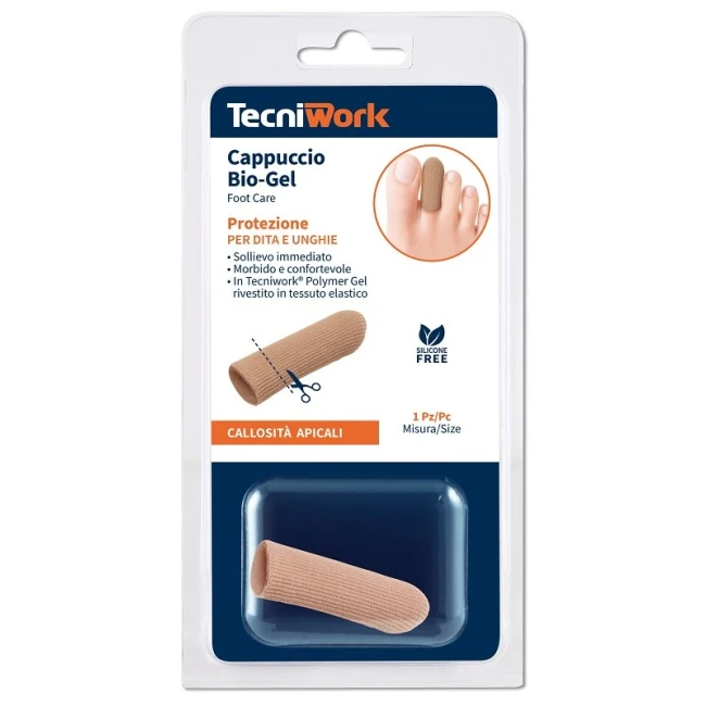 Cappuccio protettivo per dita e unghie in tessuto elastico rivestito internamente in Tecniwork Polymer Gel. Protegge la testa del dito evitando la formazione di callosità, senza creare ingombro. Evita lo sfregamento con la calzatura, previene e dona sollievo in caso di callosità e ispessimenti. Indicato anche per dita a martello, occhi di pernice, calli duri, molli, dorsali e apicali. Dispositivo medico lavabile e riutilizzabile.