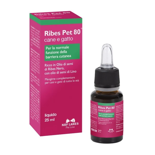 Ribes Pet 80 gocce è un mangime complementare dietetico per il supporto della funzione dermica in caso di dermatosi ed eccessiva perdita di peli nel cane e nel gatto.