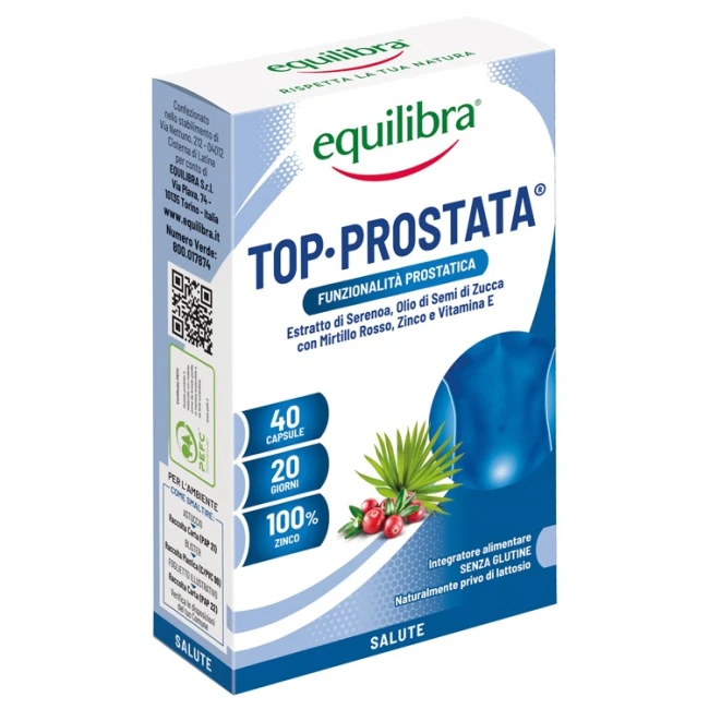 Top Prostata è un integratore alimentare di zinco e vitamina E, con serenoa repens, mirtillo rosso e olio di semi di zucca. Lo zinco può contribuire a mantenere il fisiologico benessere dell'organismo maschile: normale fertilità e riproduzione, normali livelli di testosterone nel sangue, divisione cellulare e protezione delle cellule dallo stress ossidativo.