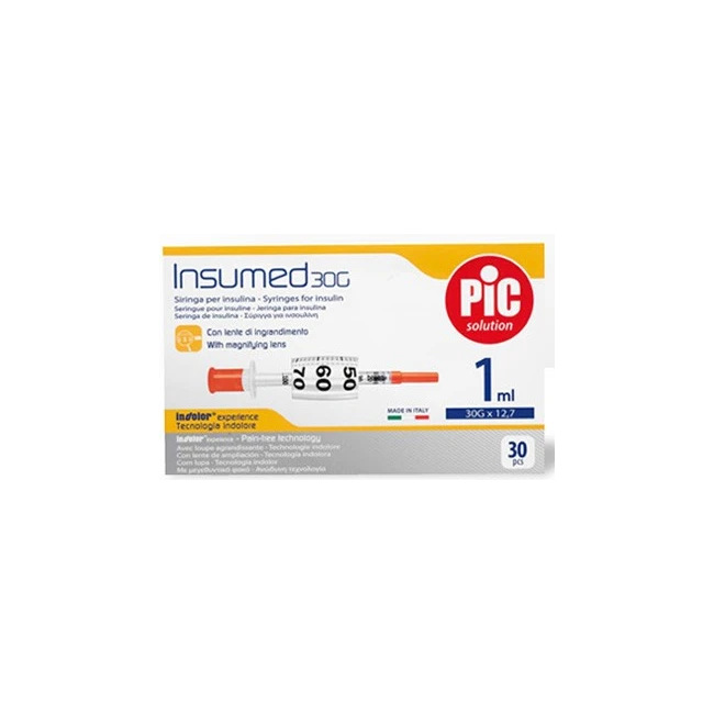 Pikdare Siringa Insulina Pic Insumed 1 Ml 100 Ui Ago Gauge 30 12,7 Mm Senza Spazio Morto 30 Pezzi