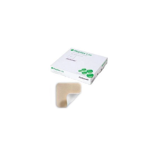 Dispositivo Medico CE. Medicazione in schiuma sottile e altamente conformabile che assorbe l'essudato e mantiene la ferita in ambiente umido. Lo strato Safetac aderisce ai bordi della ferita, impedendo agli essudati di fuoriuscire sulla cute perilesionale, riducendo così al minimo il rischio di macerazione. Lo strato Safetac assicura cambi di medicazione atraumatici. Mepilex Lite può essere ritagliato in modo da adattarsi a ferite di varia forma e collocazione. La medicazione è costituita da: