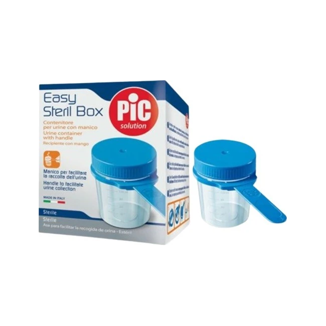 È un pratico contenitore per urina dotato di manico. Si può usare per raccogliere comodamente i fluidi organici necessari per le analisi. Permette di raccogliere le urine in modo pratico e igienico, senza fuoriuscite. Utilizzarlo in autonomia per le analisi o per semplificare la raccolta dell'urina dei bambini o di chi non è più autosufficiente. La scala graduata da 20 a 100ml consente di verificare la quantità esatta raccolta e l'etichetta adesiva aiuta nell'identificazione del campione. Easy Steril Box è sterile e monouso, ma la sua particolarità è il pratico manico per facilitare la raccolta dell'urina. Il prodotto è disponibile in un solo formato dalla capacità di 100ml, in confezione singola sigillata. In ogni confezione è presente l'etichetta adesiva da compilare e da applicare al bicchierino, per identificare più facilmente il campione.