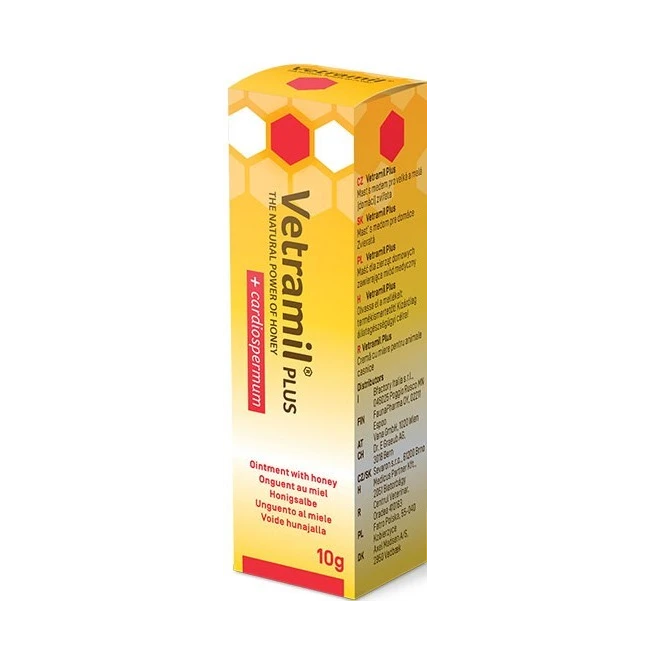 Crema a base di miele con oli essenziali ed estratto di cardiospermo. Vetramil PLUS contiene estratto di Cardiospermo che può essere usato in tutti i casi in cui è presente prurito. Vetramil PLUS contiene miele ad elevato contenuto di enzimi. In ambiente umido l’enzima glucosio ossidasi attiva il lento rilascio di piccole quantità di perossido di idrogeno. Alle basse concentrazioni, il perossido di idrogeno svolge un’azione purificante della pelle e favorisce la rigenerazione cellulare. Il basso pH di Vetramil ripristina il normale livello di acidità della pelle, gli oli essenziali allontanano gli insetti ed evitano che gli animali lecchino la crema.