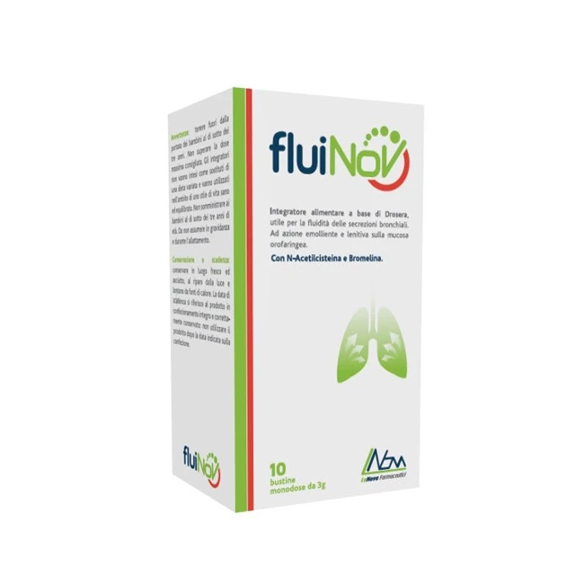 Integratore alimentare con edulcorante a base di drosera, utile per la fluidità delle secrezioni bronchiali. Ad azione emolliente e lenitiva sulla mucosa orofaringea. Con N-acetilcisteina e bromelina 2.500 GDU/g. Lo zinco e la vitamina C contribuiscono alla normale funzione del sistema immunitario. FLUINOV risulta quindi un valido aiuto per favorire il benessere delle vie aeree e migliorare la respirazione. Inoltre grazie alla presenza delle Drosera presenta azione sedativa della tosse di tipo periferico, agendo sui recettori della tosse situati nei bronchi.