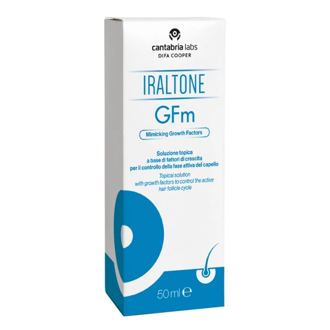 Soluzione topica ad alta concentrazione di GFm, un complesso di polipeptidi che mima l'azione dei fattori di crescita che controllano il ciclo del bulbo dei capelli.