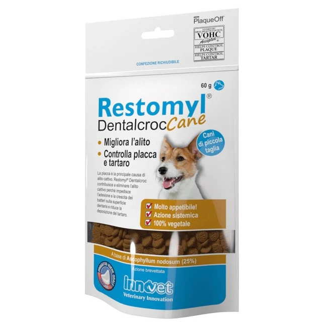 Supporto nutrizionale per la salute del cavo orale dei cani. Previene la formazione e l'adesione della placca sulla superficie dentaria, migliorando l'alito e rallentando la deposizione del tartaro. A differenza di altre misure per il controllo della placca, Restomyl Dentalcroc agisce per via sistemica. Contiene infatti una particolare alga bruna (Ascophyllum nodosum), il cui uso è stato brevettato e i cui benefici sulla salute del cavo orale sono stati dimostrati specificatamente nell'animale da compagnia*. L'alga bruna viene assorbita dopo somministrazione orale e, attraverso la circolazione, raggiunge le ghiandole salivari per concentrarsi nella saliva. Qui impedisce la crescita sulla superficie dentaria della componente batterica della placca e riduce la deposizione del tartaro. Il primo segno di un miglioramento della salute orale è la scomparsa dell'alito cattivo. Restomyl Dentalcroc non contiene alcun ingrediente che maschera il cattivo odore dell'alito.
