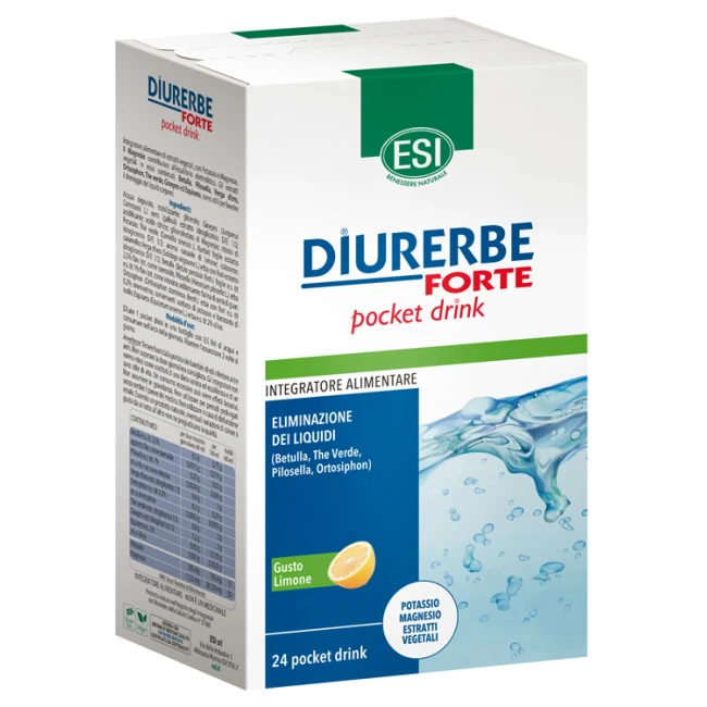 Diurerbe forte pocket drink contiene Potassio e Magnesio. Il Magnesio contribuisce all'equilibrio elettrolitico. Gli estratti vegetali in esso contenuti sono utili per favorire l'eliminazione dei liquidi in eccesso.