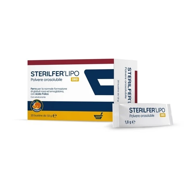 Sterilfer Lipo Oro contiene Ferro Acido folico e Vitamina C utili alla normale funzione del sistema immunitario. Inoltre il Ferro contribuisce alla normale funzione cognitiva, al metabolismo energetico, alla formazione dei globuli rossi e dell'emoglobina ed al trasporto di ossigeno nell'organismo. L'Acido folico contribuisce alla crescita dei tessuti materni in gravidanza ed alla normale emopoiesi. La Vitamina C contribuisce alla formazione del collagene per la funzione delle ossa, delle cartilagini, delle gengive e dei denti oltre ad accrescere l'assorbimento del Ferro.