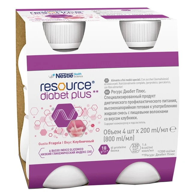 Resource® Diabet Plus è un alimento a fini medici speciali, nutrizionalmente completo, ad elevata concentrazione calorica e proteica e a basso indice glicemico (IG: 30), per la nutrizione orale di pazienti diabetici o con alterazioni del metabolismo dei carboidrati. Contiene fibre 100% solubili.