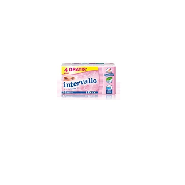Salvaslip ripiegatiSalvaslip con cuore assorbente fatto al 100% di fibre di origine naturale. È ipoallergenico e ti offre un contatto delicato con la pelle. Ripiegato in una pratica e discreta bustina Intervallo ti segue in borsa, garantendoti protezione in qualsiasi situazione. Lines Intervallo è ipoallergenico (aiuta a ridurre il rischio di allergie) e con l'ampia superficie adesiva ti garantisce un comfort straordinario rispettando la tua pelle.