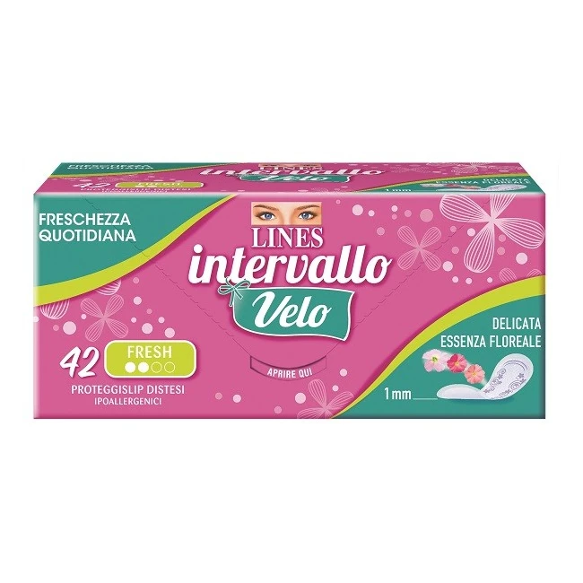 Scoprire la gamma Lines Intervallo Velo, i proteggislip Lines creati per donare una straordinaria sensazione di freschezza durante tutto il giorno, così confortevoli da non sentirli addosso. L'incredibile flessibilità di Lines Intervallo Velo garantisce il massimo del comfort in un solo millimetro di spessore. Grazie alle fibre superassorbenti il prodotto assicura, inoltre, la protezione di cui c'è bisogno.