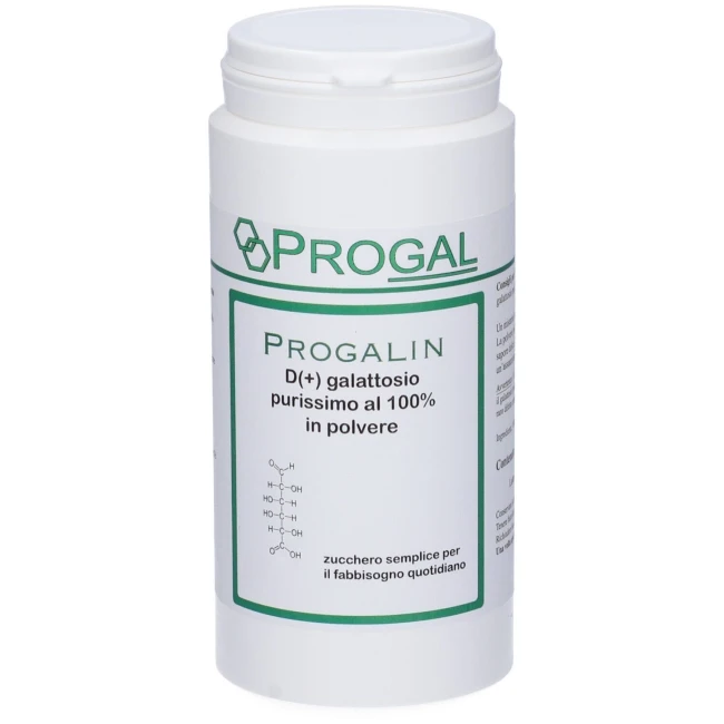 Progalin in polvere contiene galattosio purissimo al 100% in polvere, uno zucchero semplice per il fabbisogno quotidiano che appartiene alla stessa famiglia dello zucchero di canna, fruttosio e lattosio.