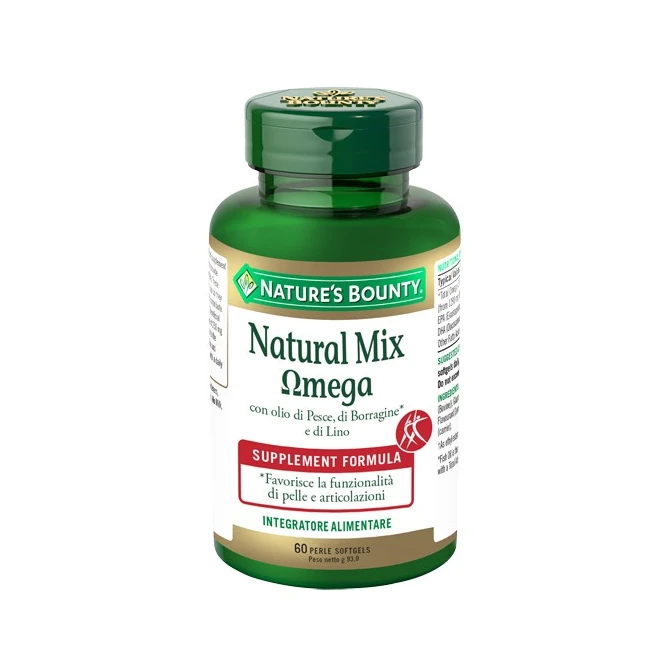 Natural Mix mega è un integratore alimentare a base di olio di pesce, olio di semi di lino e di borragine. L'EPA e il DHA dell'olio di pesce contribuiscono alla normale funzione cardiaca. L'effetto benefico si ottiene con l'assunzione giornaliera di 250 mg di EPA e DHA. L'olio di semi di borragine favorisce il trofismo e la funzionalità di pelle e articolazioni. L'olio di semi di lino favorisce l'integrità e la funzionalità delle membrane cellulari per un normale metabolismo lipidico. La vitamina E contribuisce alla protezione delle cellule dallo stress ossidativo.