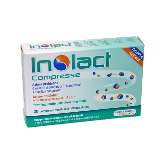 Inolact è un integratore alimentare ad attività simbiotica costituito dall’associazione di fermenti lattici (componente probiotica) con Frutto-oligosaccaridi (FOS)(componente prebiotica).