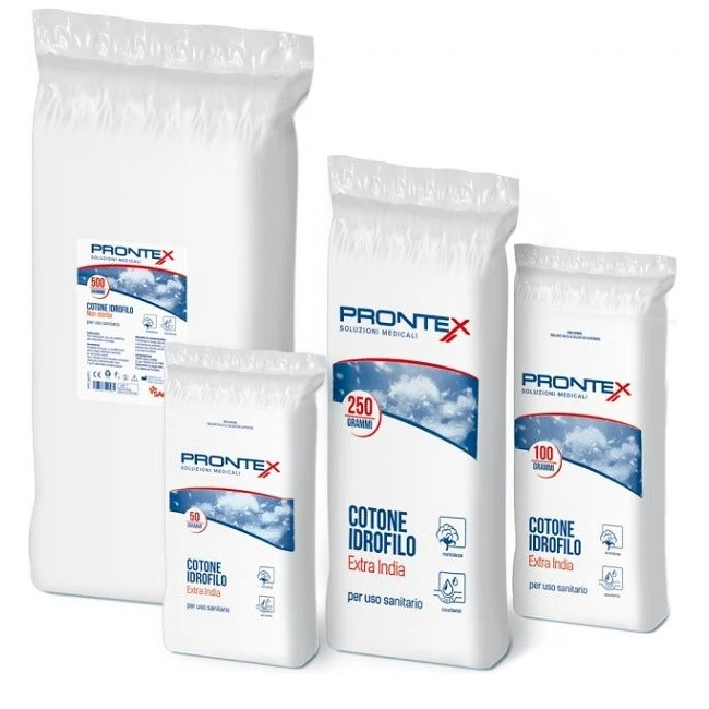 Cotone idrofilo Extra India per uso sanitario e cosmetico Esplora la morbidezza e la versatilità con PRONTEX COTONE Extra India, disponibile in cinque formati differenti (50g, 100g, 250g, 500g, 1000g). Questo pregiato cotone rappresenta la scelta perfetta per le tue esigenze di cura personale e igiene quotidiana.
