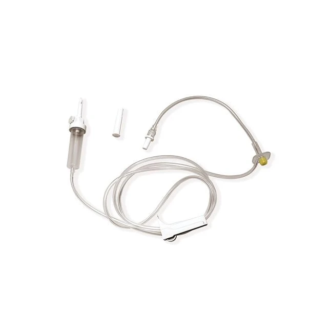 Provvisto di perforatore con cappuccio protettivo, filtro aria antibatterico con tappino di chiusura, camera di gocciolamento altamente trasparente, filtro soluzione 15-20 mcm e regolatore di flusso tipo roller. Cono Luer Lock. Sterile, monouso, apirogeno, atossico, latex free e ftalati free.