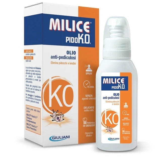 Trattamento spray contro pidocchi e lendini, a base di oli dermo-affini e senza agenti chimici che provoca la morte dei pidocchi e delle loro uova per soffocamento rispettando la sensibilità della cute e i capelli. Agisce in 15 minuti. Da utilizzare in caso di pediculosi accertata del capo. A differenza dei prodotti antipediculosi a base di agenti chimici, svolge un'azione di tipo meccanico: il complesso Oli-derma, associazione di un olio dermo-affine adatto anche alle cuti più sensibili e l'olio di Bisabololo (derivato dal fiore di Camomilla), penetra nelle vie respiratorie dell'insetto e nelle uova, ne avvolge il corpo, causandone la morte per soffocamento. I pidocchi non possono così sviluppare resistenza. Grazie all'azione idratante dei suoi oli, aiuta inoltre ad attenuare le irritazioni provocate dai pidocchi. È in formulazione spray per favorire la distribuzione uniforme su capelli e cuoio capelluto. La fine nebulizzazione facilita la penetrazione dell'olio nelle vie respiratorie dell'insetto. Nella confezione è incluso, in omaggio, un pettine a denti fitti per rimuovere i pidocchi e le uova. Profumo fruttato.