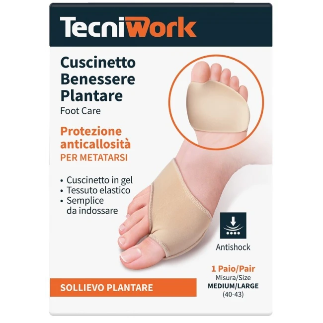 Benessere Plantare con cuscinetto in gel di protezione per l’avampiede, utile in caso di dolore sotto i metatarsi. Previene e dona sollievo in caso di sollecitazioni (corsa, sport), posizione in piedi prolungata e callosità. Dispositivo medico lavabile e riutilizzabile.