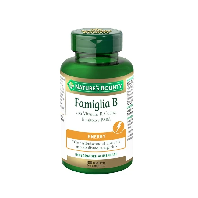 Famiglia B è un integratore alimentare a base di vitamine del gruppo B, colina, inositolo e PABA. L'acido pantotenico, la niacina, la riboflavina, la vitamina B12, la vitamina B6 e l'acido folico contribuiscono alla riduzione di stanchezza e affaticamento. Inoltre niacina, vitamina B6, riboflavina, tiamina, biotina e vitamina B12 contribuiscono al normale funzionamento del sistema nervoso e al normale metabolismo energetico, mentre per la naturale funzione psicologica sono utili niacina, vitamina B6, tiamina e acido folico. La biotina, infine, contribuisce al mantenimento di pelle e capelli normali. Adatto anche a vegetariani e vegani.