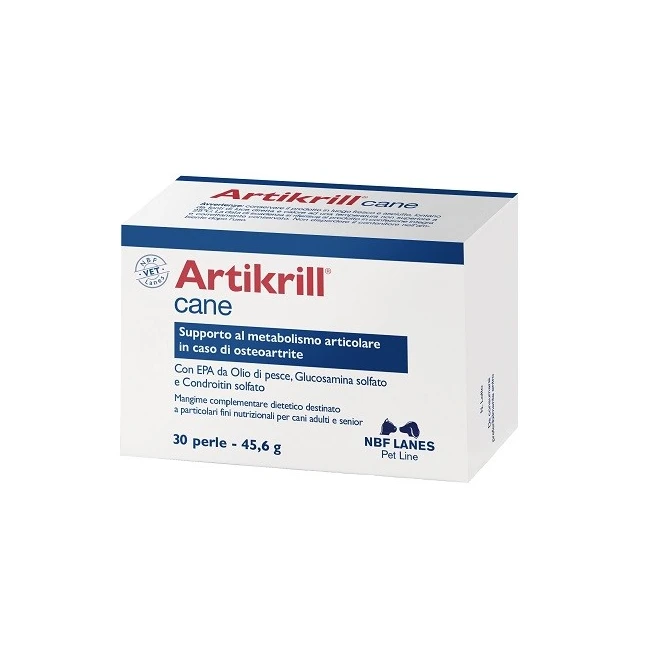 Artikrill cane è un mangime complementare dietetico formulato con acidi grassi omega-3 (EPA) da olio di pesce e con un livello adeguato di vitamina E per il supporto del metabolismo articolare in caso di osteoartrite del cane.