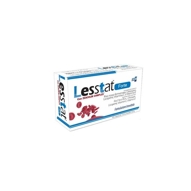 Integratore alimentare di riso rosso fermentato, chitosano, licopene, vitamina C e vitamina E utile in caso di diminuito apporto od aumentato fabbisogno di tali nutrienti. Lesstat Forte deve essere sempre utilizzato come integrazione, associata ad un corretto stile di vita (alimentazione controllata e bilanciata ed attività sica regolare).