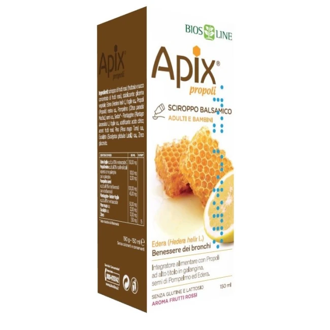 Integratore alimentare con propoli ad alto titolo in galangina, semi di pompelmo ed edera. Apix Propoli Sciroppo balsamico associa le ben note proprietà della propoli, ad alto titolo in galangina, a quelle antiossidanti dei semi di pompelmo, ricchi in bioflavonoidi. Contiene inoltre, estratti di edera e piantaggine, oli essenziali di eucalipto e pino mugo e zinco. L'edera, titolata in ederacoside C, fluidifica le secrezioni bronchiali, la piantaggine titolata in verbascoside, svolge un'azione emolliente e lenitiva sulle mucose delle vie respiratorie, mentre gli oli essenziali di eucalipto e pino mugo svolgono un'azione balsamica. Infine, lo zinco favorisce le naturali difese dell'organismo.