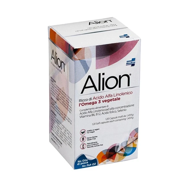 Complemento alimentare di acido alfa linolenico con vitamina B6, vitamina B12, acido folico e selenio. Indicato nelle situazioni carenziali o di aumentato fabbisogno, sia fisiologico che secondario ad alterazioni degli apporti o utilizzazioni dei suddetti componenti. ALION è ricco di acidi grassi Omega 3.