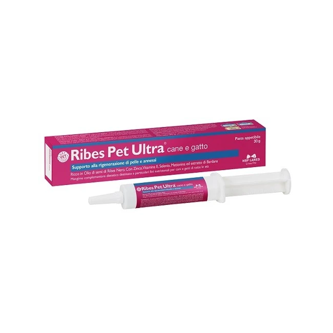 Ribes Pet Ultra pasta appetibile è un mangime complementare dietetico destinato a particolari fini nutrizionali per cani di piccola taglia e gatti, formulato in pasta appetibile ad elevata concentrazione di acidi grassi essenziali e con estratto di bardana, come supporto della funzione dermica in caso di dermatosi ed eccessiva perdita di peli. L'apporto dietetico di acidi grassi polinsaturi w-6 e w-3 favorisce la normale funzionalità della barriera cutanea. Ricco in olio di ribes nero a elevata concentrazione di acidi grassi essenziali con estratto di bardana e vitamina E.