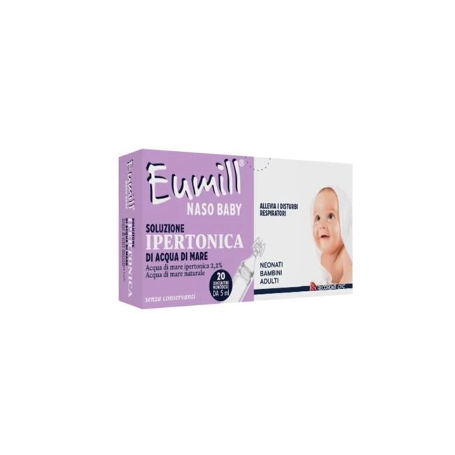 Soluzione sterile di acqua di mare ipertonica. La sua formula naturale è indicata nel neonato, nel bambino e nell'adulto per idratare e dare sollievo alle vie respiratorie in caso di congestione, disturbi ostruttivi, respiro affannoso o tosse cronica. L'azione osmotica di Eumill Naso Baby soluzione ipertonica agevola la fluidificazione e l'eliminazione del muco in eccesso, favorendo lo spostamento delle secrezioni all'interno delle vie respiratorie. Eumill Naso Baby soluzione ipertonica contribuisce al recupero del benessere respiratorio e migliora la qualità della vita. La soluzione Eumill Naso Baby soluzione ipertonica può essere utilizzata mediante terapia inalatoria o aerosolterapia.