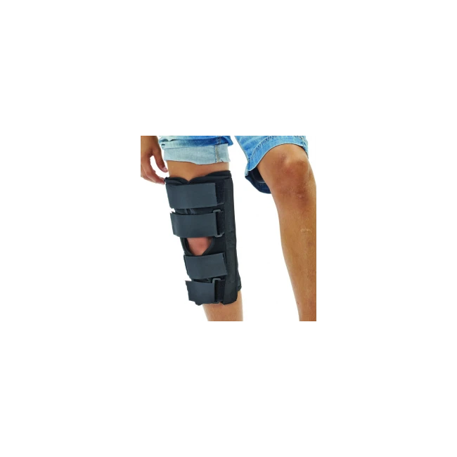 Due stecche rigide laterali modellabili e doppio steccaggio posteriore pre-modellato e modellabile per garantire l'immobilizzazione in estensione a 0°. Struttura a 3 pannelli adattabile a gambe di diverse circonferenze. Interno in cotone per un maggior comfort, 4 cinghie regolabili a chiusure contrapposte.