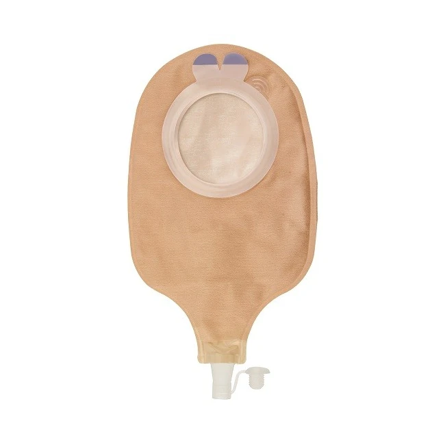 Sacca urostomia per sistema due pezzi, trasparente od opaca, di forma anatomica, dotata di flangia per aggancio alla placca, rivestita sul lato corpo da un morbido tessuto non tessuto, in versione opaca o trasparente. La versione opaca sul lato esterno è rivestita da uno specifico materiale che oltre a ridurre i rumori evita spiacevoli attriti con gli abiti. Dotata di sistema antireflusso e di scarico, raccordabile a raccoglitore da gamba o da letto.