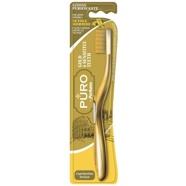 Spazzolino antiplacca con setole arricchite con ioni di oro (setole di colore dorate), per un’azione purificante, gentile e non abrasiva sullo smalto dei denti. Testina con setole di durezza media, dalle punte affusolate per una pulizia efficace, ma delicata. Manico in materiale bi-componente (gomma e plastica), declinato nei colori bianco e nero. Il retro della testina è un pratico pulisci lingua.