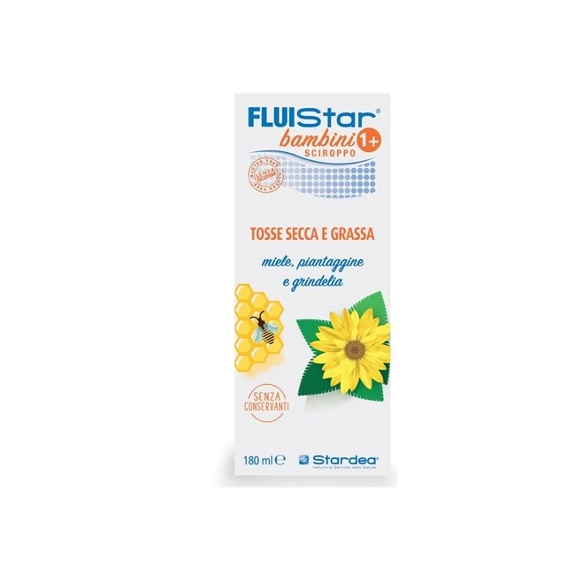 Sciroppo per bambini per tosse secca e grassa.Grazie alla sua specifica composizione, Fluistar esplica un effetto lubrificante e protettivo sulle mucose delle prime vie aeree alleviandone gli stati irritativi. Grazie al suo effetto emolliente, calma la tosse sia secca che grassa, fluidificando il muco ove presente e facilitandone l'espulsione. Favorisce il recupero del fisiologico benessere.