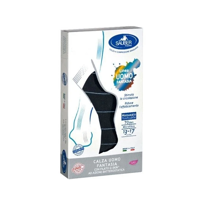 Calze uomo fantasia a compressione graduata in filato Q-SKIN, ad azione batteriostatica per facilitare la traspirazione della pelle e ridurre la sudorazione del piede. Possono essere abbinate sia ad un look classico ed elegante, sia ad un abbigliamento casual e giovanile. Ideali per essere indossate in qualunque occasione, dal lavoro al tempo libero, fino all’occasione speciale. Realizzate con polsino morbido che non stringe, e con punta e tallone in tinta unita.