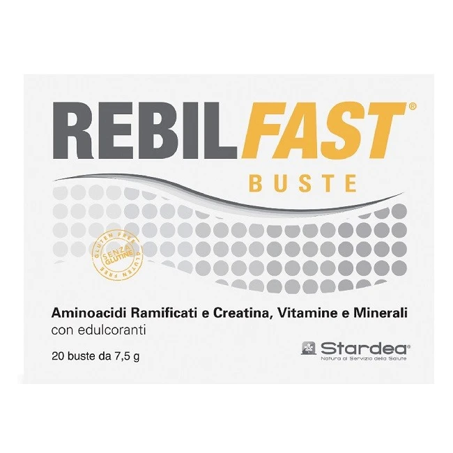 Intergatore alimentare e rappresenta un complemento alla dieta di soggetti che necessitano nutrienti utili alla fisiologica funzione della muscolatura. REBILFAST apporta amminoacidi ramificati, nutrienti utili nella dieta dello sportivo e associa creatina, vitamine e minerali. La creatina (nella dose di assunzione di 3 g/die) è in grado di incrementare le prestazioni fisiche di adulti che praticano un esercizio fisico intenso, in caso di attività ripetitive di elevata intensità e di breve durata. Zinco e magnesio contribuiscono alla normale sintesi proteica, il calcio e il magnesio presenti contribuiscono inoltre ad un fisiologico metabolismo energetico e ad una normale funzione muscolare. La presenza di vitamina B6 contribuisce ad un normale metabolismo delle proteine e del glicogeno, e alla riduzione della stanchezza e dell’affaticamento. La vitamina C contribuisce alla normale formazione del collagene per la fisiologica funzionalità di ossa e cartilagini. REBILFAST è senza zuccheri e può essere adatto anche per soggetti diabetici.
