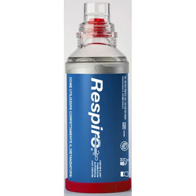 Inserire l’erogatore nel distanziatore Respiro®, scuotere energeticamente, procedere quindi con l’erogazione dell’aerosol e respirare con la bocca, trattenere il respiro per 10 secondi.