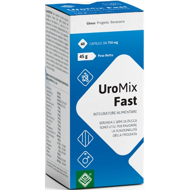 Uromix fast è un integratore alimentare ideato specificamente per l’uomo a base di estratti vegetali utili per favorire la funzionalità della prostata (serenoa e semi di zucca), la funzionalità delle vie urinarie e il drenaggio dei liquidi corporei (equiseto, uva ursina e ortica), con vitamina C, vitamina E, zinco, selenio e manganese, che contribuiscono alla protezione delle cellule dallo stress ossidativo.