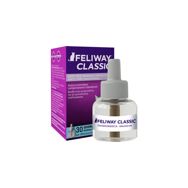 Aiuta i gatti a tenere il ritmo della vita moderna, consentendo un pieno appagamento ed evitando marcature urinarie, graffiature o tendenza a nascondersi. Feliway Classic è una copia del feromone facciale felino che i gatti depositano strofinando il loro muso sulle persone, mobili, porte e altri oggetti nella casa. È il segno che si sentono a loro agio e sicuri nell'ambiente in cui vivono. Feliway Classic utilizzato nell'ambiente in cui vive il gatto fornisce la stessa sensazione di sicurezza dei feromoni depositati dai gatti in natura.