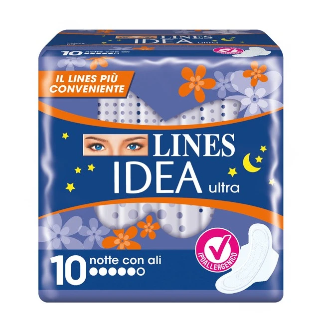 Gli assorbenti Lines Idea sono ipoallergenici e, con il 25% in più di cuore assorbente, garantiscono la massima assorbenza offrendo una continua sensazione di morbidezza sulla pelle. Dotati di un nuovo design super femminile assicura il massimo comfort e protezione per renderti libera di vivere la tua giornata anche con il ciclo.