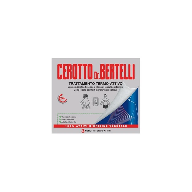 Trattamento cosmetico termo-attivo. Un balsamo impacco realizzato con estratti ed oli 100% vegetali ed aromatici, su di un sottile morbido supporto adesivo. L'applicazione del Cerotto Dr. Bertelli sviluppa una sensazione di benefico calore che attiva la microcircolazione locale, rivitalizza e rinforza i tessuti epidermici. Una vera carica di energia attiva che migliora l'idratazione e l'elasticità cutanea. La speciale formula contiene oli aromatici considerati efficaci per le loro proprietà rilassanti che assicurano quello stato di benessere e comfort che aiuta a sciogliere stress e tensione. Dermatologicamente testato.