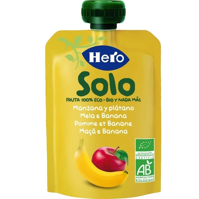 Hero Solo mela e banana è una deliziosa merenda che puoi portare sempre con te, grazie alla pratica confezione tascabile e richiudibile. Non aggiungiamo nessun altro ingrediente, solo mela e banana.