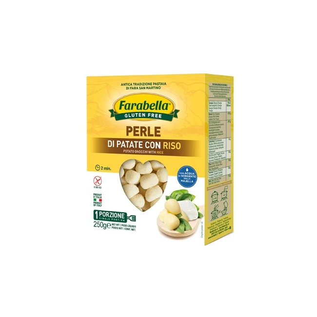 Perle di patate con riso senza glutine specificamente formulati per persone intolleranti al glutine. Adatto a vegani. Senza OGM e uova. Con acqua di Sorgente della Majella.