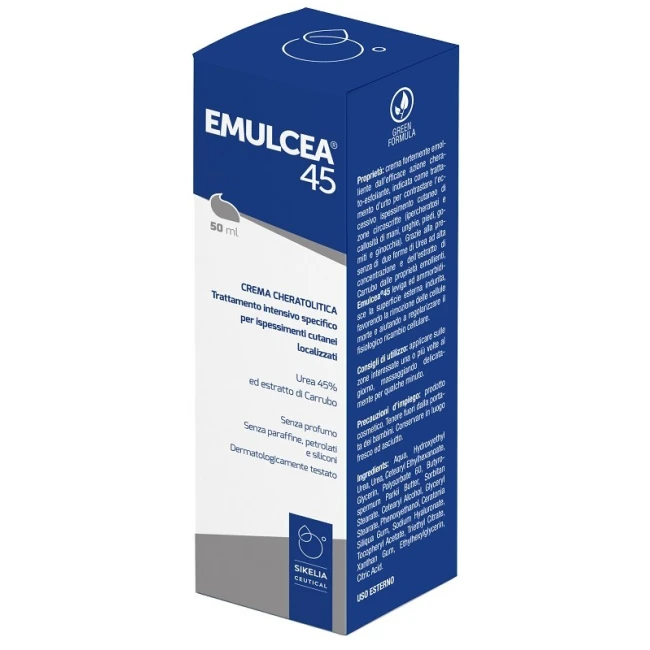 Crema fortemente emolliente dall'efficace azione cherato-esfoliante, indicata come trattamento d'urto per contrastare l'eccessivo ispessimento cutaneo di zone circoscritte (ipercheratosi e callosità di mani, unghie, piedi, gomiti e ginocchia). Grazie alla presenza di due forme di urea ad alta concentrazione e dell'estratto di carrubo dalle proprietà emollienti, Emulcea leviga ed ammorbidisce la superficie esterna indurita, favorendo la rimozione delle cellule morte e aiutando a regolarizzare il fisiologico ricambio cellulare.