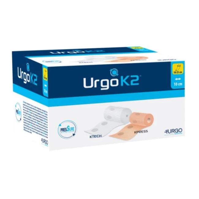 UrgoK2 è un kit di bendaggio compressivo multicomponente che combina due differenti tipologie di bende: una benda interna a corta estensibilità e una benda esterna a lunga estensibilità.