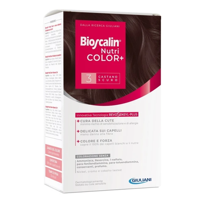 Dettagli Giuliani Bioscalin Nutricolor Plus 3 Castano Scuro Crema Colorante 40 Ml + Rivelatore Crema 60 Ml + Shampoo 12 Ml + Trattamento