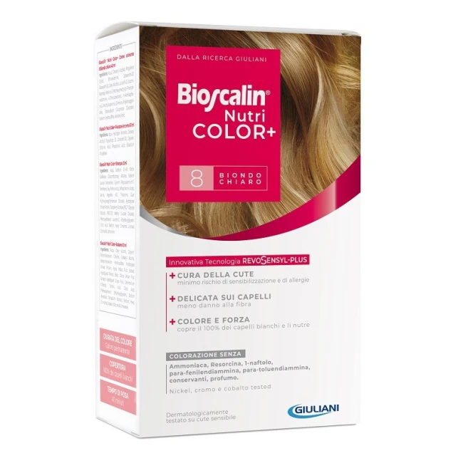 Dettagli Giuliani Bioscalin Nutricolor Plus 8 Biondo Chiaro Crema Colorante 40 Ml + Rivelatore Crema 60 Ml + Shampoo 12 Ml + Trattamento
