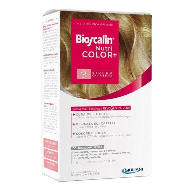 Dettagli Giuliani Bioscalin Nutricolor Plus 9 Biondo Chiarissimo Crema Colorante 40 Ml + Rivelatore Crema 60 Ml + Shampoo 12 Ml + Trattam