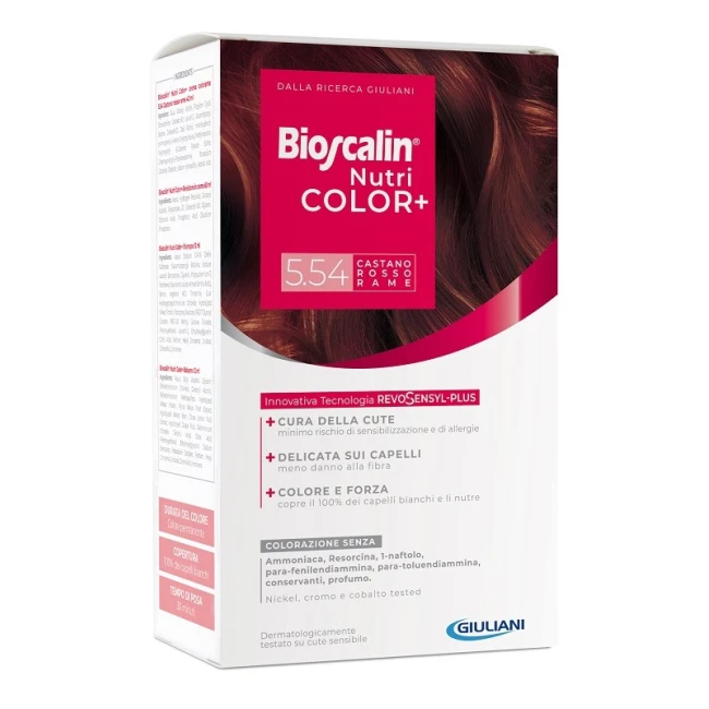 Dettagli Giuliani Bioscalin Nutricolor Plus 5,54 Castano Rosso Rame Crema Colorante 40 Ml + Rivelatore Crema 60 Ml + Shampoo 12 Ml + Trat