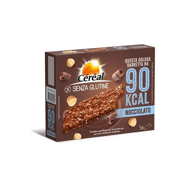 Barrette ai cereali ricoperte di cioccolato al latte e nocciole. Specificamente formulate per persone intolleranti al glutine.