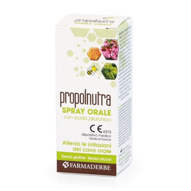 Propolnutra Spray Orale è uno spray pronto all’uso (con acido ialuronico, estratti di propoli, altea ed echinacea, olio essenziale di pino e melaleuca) utile per alleviare e prevenire gli stati irritativi della gola. Esplica un effetto protettivo ed idratante della mucosa orale, favorendo il miglioramento dei sintomi che accompagnano i disturbi del cavo orale (raucedine, pizzicore, bruciore, mal di gola, secchezza delle mucose) in caso di patologie infiammatorie o di esposizione ad agenti esterni irritanti quali freddo, fumo, smog e polveri. La presenza degli oli essenziali contribuisce a donare una sensazione di freschezza.